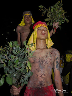 The Taoist priest will pray for the warriors who play Lord Handan at the bombarding ceremony. The Taoist priest speaks spell when burns the incantation,written with Taoist magic figures on a yellow rectangle paper, above a bow of clean water. He puts the ash of the incantation into the bow, meaning that he magic power has been infilled the water. Then the Taoist priest throws the drops the clean water from the bowl toward the warriors with a banyan leaf.
